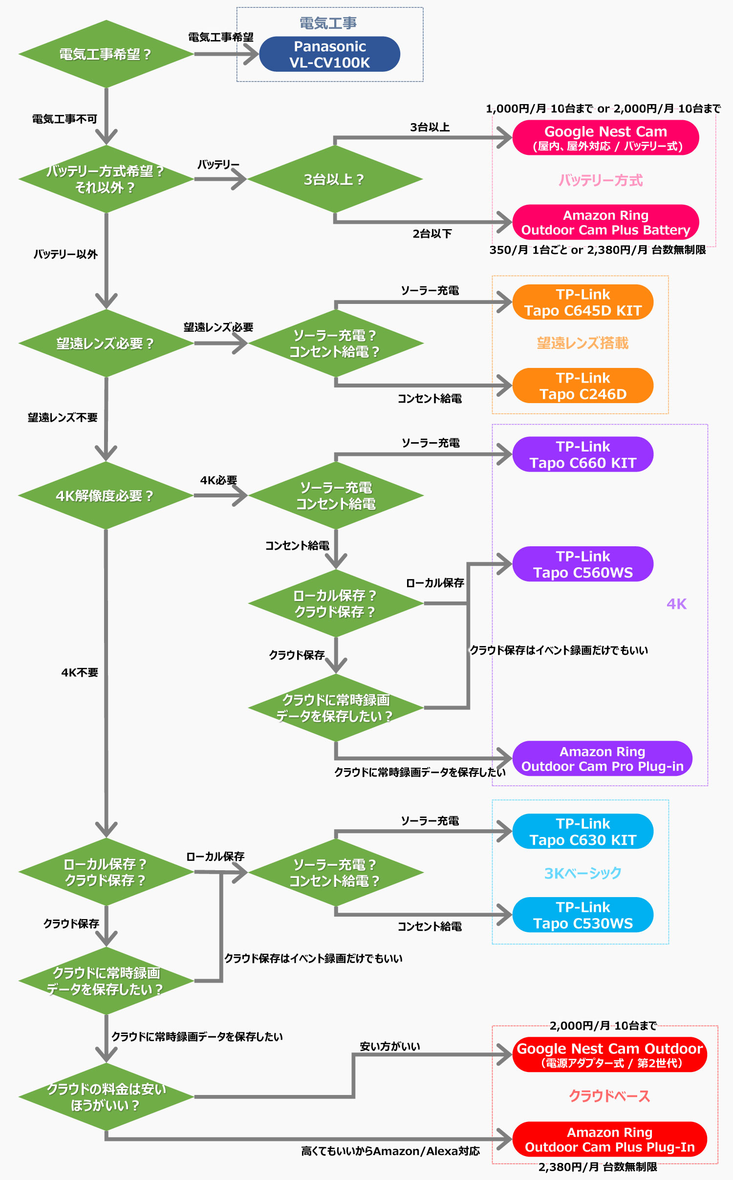 ここまで解説してきたポイント別に、オススメの防犯カメラを選べるフローチャートを用意しました。