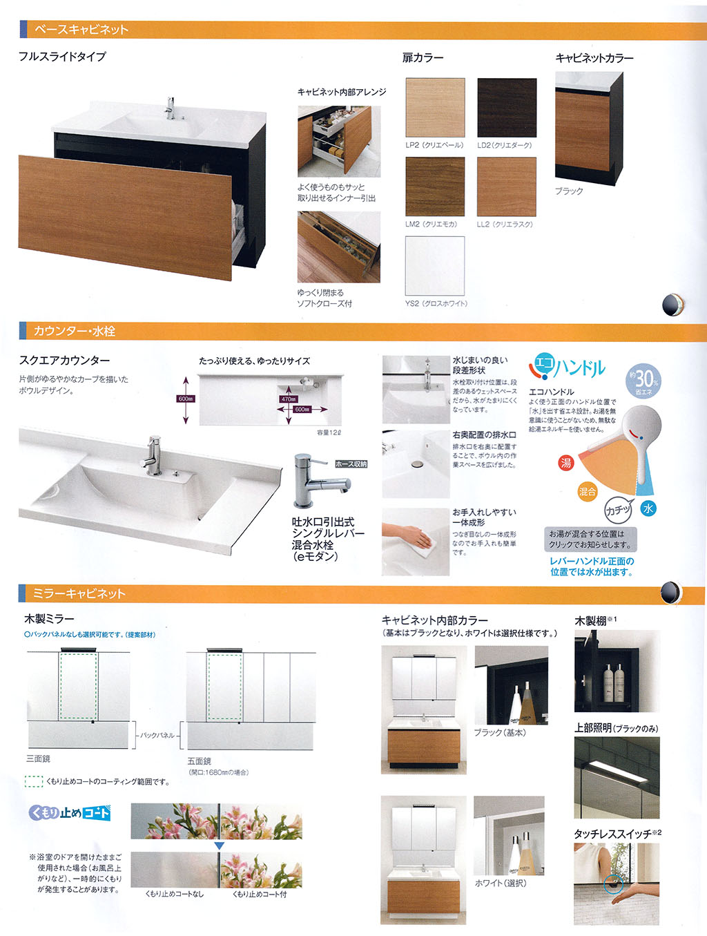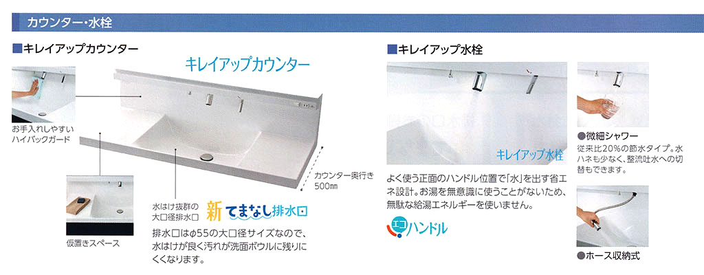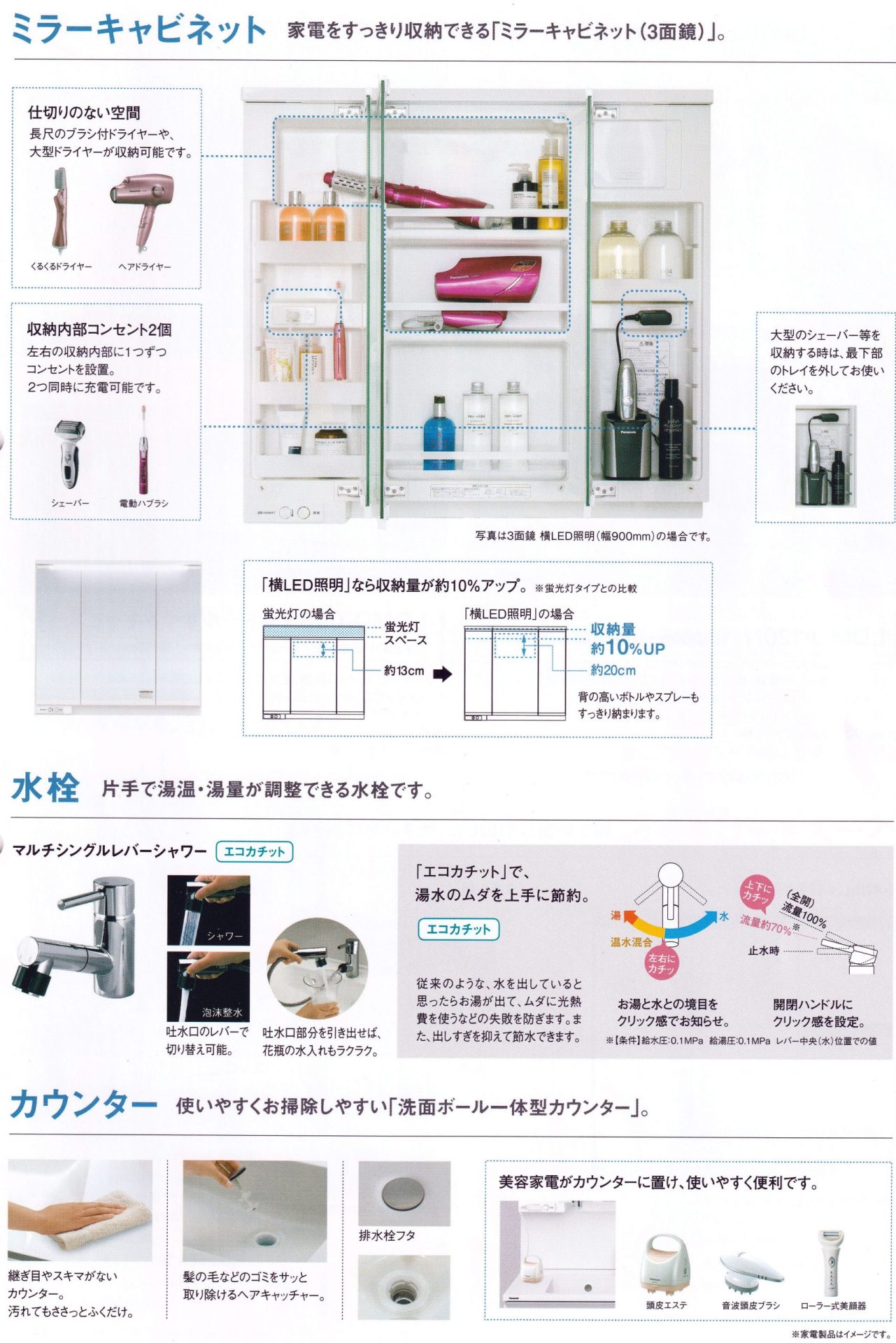 L.C.の特徴は、キレイアップ水栓。水栓が洗面ボウルではなく、三面鏡がある上側に付いているので、水栓周りが汚れたり水垢がついたりといったころが軽減されます。